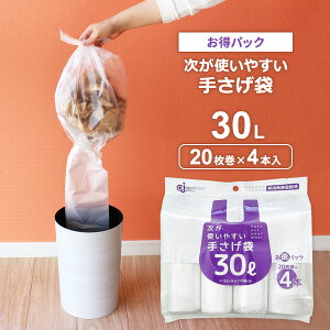 1ロールに20枚の手さげ袋がつながってコンパクトに!20枚分の手さげ袋が1本のロール状になった、便利な30Lサイズのポリ袋。4本がセットになったお得パック。つながったままゴミ箱にかけて使用する手さげ袋で、取り替え時に新しいゴミ袋を