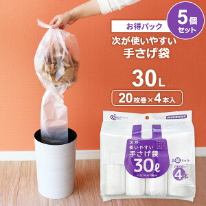 【5個セット】1ロールに20枚の手さげ袋がつながってコンパクトに!20枚分の手さげ袋が1本のロール状になった、便利な30Lサイズのポリ袋。4本がセットになったお得パックの5個セット。つながったままゴミ箱にかけて使用する手さげ袋で、取