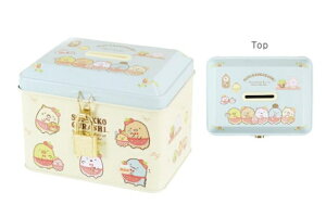 サイズ:約H84xW113xD83mm 材質:ブリキ 原産国:中国 すみっコぐらしのカギ付き缶バンク カギ付きで安心、大切なものがしまえる