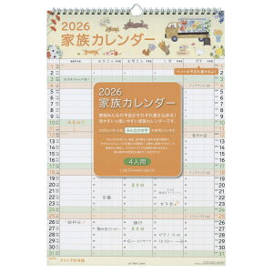 家族みんなの予定がひと目でわかる家族カレンダー。最大で家族4人分とみんなの予定を書き分けられるライン入りです。人気作家いわぶちさちこさんの、やわらかなイラストが描かれています。紙リング仕様月間予定表:2026年1月から2026年12