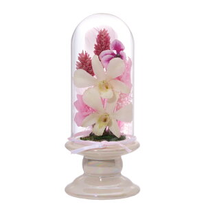 商品情報使用花材ドライフラワー:デンファレ・菊・ラグラス・パンリードプリザーブドあじさい・かすみ草・ルスカス素材ガラスニヤトの台座カラー白桃白/桃サイズ高さ:22センチ直径:11センチ注意点直射日光に当たる場所は変色のおそ