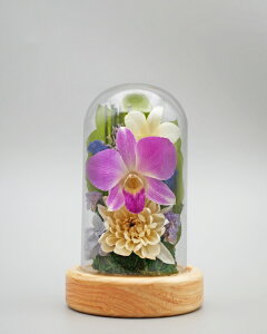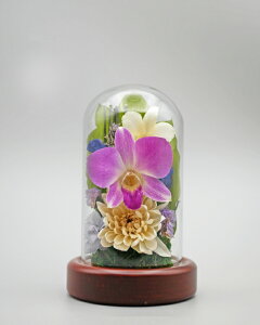商品情報使用花材ドライフラワー:デンファレ・菊・リンドウ・パンリードプリザーブドスターチス・ルスカス・あじさい素材ガラスヒノキの台座カラー白桃若草サイズ高さ:15センチ直径:8.5センチ注意点直射日光に当たる場所は変色のお