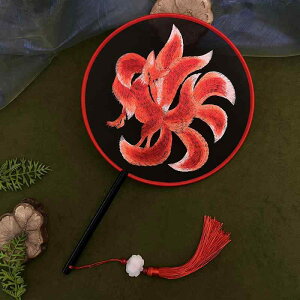 ・カテゴリ: 団扇・素材: 絹・サイズ: 扇面直径約21cm、持ち手約15cm・工芸: 刺?・骨組み素材: スチール・スタイル: 中国風・カラー展開: 黒地赤九尾狐、紫九尾狐、桃花九尾狐