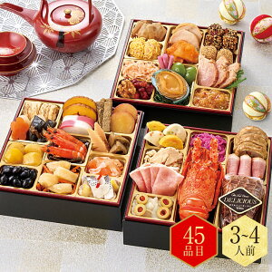 ★本体価格34,560円に送料1,560円を含めた価格となります。 タイプ:和洋 消費期限:2026年1月1日(木・祝) サイズ:19.1×19.1cm 内容:三段重/46品目 ※諸事情により、献立の内容や食材の産地が変更となる場合が...