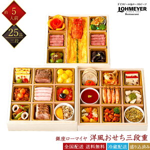 商品詳細 屋号 銀座ローマイヤ 商品名 銀座ローマイヤ 洋風おせち三段重 商品番号 lohmeyer-san ジャンル 洋風 タイプ 盛込み済 品目数 25品目 人数前 約5人前 段数/ サイズ 三段/...
