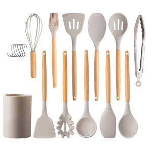 シリコーン製キッチンツールをまとめた豪華な12点セット。食品グレードシリコンで作れているので、フライパン&鍋などに優しくて傷を付けません持ち手は木で作られているので、熱くならず、グリップ感も抜群。耐熱温度-40℃〜230℃になり