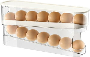 「省スペース設計のコンパクト収納」 この卵ケースは、冷蔵庫の棚に収まるコンパクトなデザインです。スペースを節約し、卵置き場所をしっかり確保するエッグホルダーとして、キッチンの整理整頓に最適です。「ローリング機能で卵の取