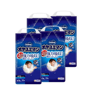 内容等予告なく変更する場合がございます。予めご了承ください。 ■製品名 ムーニー オヤスミマン 男の子 Lサイズ 夜用オムツ 30枚×4袋 ■適応体重 9kg〜14kg ■商品説明 ・超強力吸収で朝までモレ0へ ・