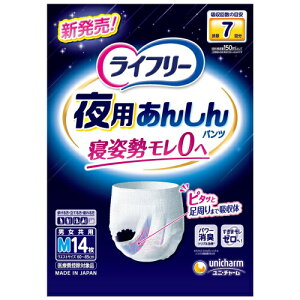 【商品名】 ユニ・チャーム ライフリー夜用あんしんパンツ7回M14枚4P 【ジャンル・特徴】 股下のすきまを防ぎ、夜の寝姿勢でもモレずにしっかり吸収。