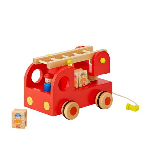 木や布のぬくもりを大切にした知育玩具が人気のエド・インターの木製おもちゃ、「カタカタ 森の消防隊」。運転手さんと4人の消防士さんをのせた、はしごのついた消防車。カタカタカタ・・・。消防士さんのブロックがはしごを回転しな