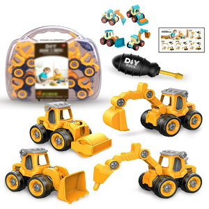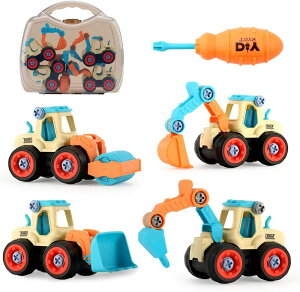 【 組み立てできるのDIY建設車両セット】レンチ付き ねじ、タイヤなどの部品を取り外しでき、ショベルカー ボール盤 ローラーカー ブルドーザー 4種類の建設車両のを組み立てできます!子供は自分の認識によって 自由に想像して 色々な工