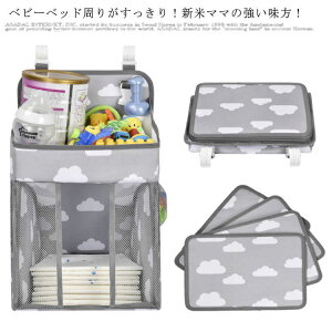 ベビーベッド周りがすっきり!新米ママの強い味方!赤ちゃんの様々な必需品をまとめて収納する吊り下げポケット。オムツや着替えを収納するメインポケット、おもちゃや絵本を収納する両サイドメッシュポケット、ミルクや哺乳瓶、薬、