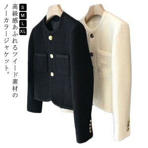 高級感あふれるツイード素材のノーカラージャケット。表面感のあるツイード素材にラメを加え、華やぎをプラスしたポリエステルツイード素材。しっかりとした厚みがありつつも軽さのある素材をセレクトし、快適な着心地に仕上げました