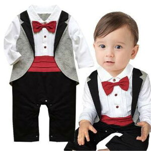 蝶ネクタイがクールで、お食い初めや結婚式などのイベントにピッタリのフォーマルカバーオール!前が全開タイプなので着せやすい! ジャケットはロンパースと一体になっています。 蝶ネクタイが付いているロンパースが大注目! ボタン