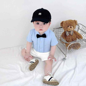 ワイシャツ風の半袖ロンパース。柔らかな綿素材なので、赤ちゃんの負担になりません。蝶ネクタイがついているようなデザインが男の子らしくてよいですよね。お腹部分は閉じるデザインで、お腹が出てしまう心配がありません。股下のス