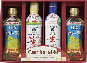 もらってうれしい調味料ギフト 品名:カンフォータブル 品番:CF-25C セット内容:日清キャノーラ油(350g)×2、キッコーマン(しぼりたて生しょうゆ・塩分ひかえめ丸大豆生しょうゆ)(各450ml)×各1...