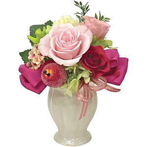 ●商品名/フェリス ピンク bc-13099-P●商品内容/プリザーブドフラワー(バラ、アジサイ)フェイクフラワー(アジサイ、ヒバーナム、マム、リンゴ、リーフ)、リボン・花器(陶器)・お手入れのしおり付(現品約12×11×16cm・ク...