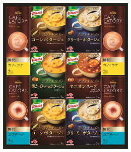 ■商品内容:クノール カップスープギフトレシピ3袋入(コーンポタージュ57g・クリーミーポタージュ49.8g×各2、オニオンスープ39.3g・栗かぼちゃのポタージュ56.1g×各1)、ブレンディカフェラトリースティック...