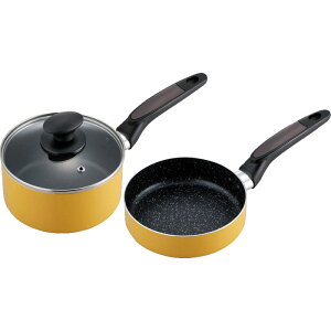 内面はマーブルふっ素樹脂加工で焦げつきにくく、お手入れラクラク。重ねて収納できます。IH200V対応。【パッケージサイズ】335×175×150mm【内容】フライパン16cm・片手鍋16cm×各1、ガラス蓋【材質】アルミ二ウム合金、ス...