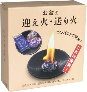 現代のライフスタイルに合った、新しい「迎え火・送り火」です。 オガラや木片を使わず、コンパクトに迎え火や送り火が行えます。 「迎え火」「送り火」は約3分間で燃え切り、片付けもラクです。 内容:器1枚、「迎え火」「送り火」各1