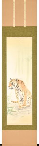 仕様 サイズ 掛け軸寸法:半切立 約横47×縦190cm 収納箱 1.外箱 2.高級桐箱 説明 虎は「一日にして千里を行き、千里を還す」といわれるように、強靭な生命力であらゆる厄災を振り払い、家運隆盛を導くといわれています。国内表装・肉筆