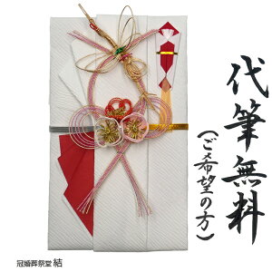 日本の伝統色「桜」を用いた、上品で落ち着きのある祝儀袋です。越前和紙を使用し、筆記適性に優れています。水引はあわじ結びで、金額目安は2万〜5万円となっております。中袋と短冊(寿、御結