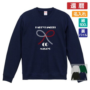 名前を入れることのできる還暦トレーナー(スウェット)。縁起の良い水引デザイン。大切な人の還暦のお祝いに是非ご利用ください。天竺編みを組み合わせた表面は伸縮性がありなめらかな風合い、裏面は裏糸をパイル状に編み込んで浮か