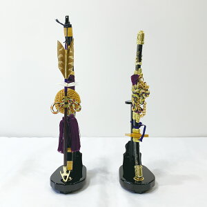 サイズ:高さ30cm 幅6.5cm 奥行9cm 材質 弓:天然羽 / 木製台 太刀:樹脂製 / 木製台 ※太刀は鞘から抜けないよう台に固定されおります。 \和風インテリアのアイテムに/ 兜飾りや子供大将飾りなどのお節句人形と一緒に飾る...