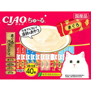 液状おやつです。舐めて食べられるので、子猫や高齢猫ちゃんも食べやすいおやつです。まぐろ、まぐろ&ほたて貝柱、かつお、宗田かつお&かつお節の4種が各10本入っています。商品内容 内容量/14g×40本。