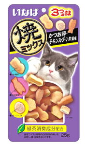 【商品名称】焼ミックス 3つの味 かつおチキンいか風味 25g メーカー:いなばペットフード ブランド:焼ミックス 【商品特徴】3種類の味を一緒に楽しむことができるミックスタイプ。 ■緑茶エキスが腸管内の内容物の臭いを吸着し、糞・