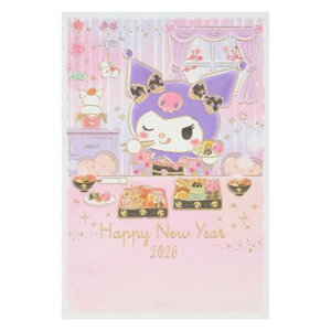 着物姿のクロミが豪華なおせちを食べている、お正月ならではの楽しいデザインです。 金箔線で描かれ、背景やおせちなど全体がやさしい色味でまとめられています。 ●郵送の際は切手をお貼りください。詳しくは日本郵便株式会社Webサイ