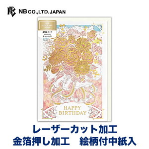 繊細なレーザーカットデザインの誕生日カードです。金箔押し加工がきらめきます。 レーザーカットで花束を繊細にデザインし、背景の花畑と重ねることで華やかに仕上げました。 ※レーザーカット加工特有の茶色い焦げが見られる箇所が