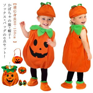 かぼちゃの服+帽子+ソックス+バッグの4点セット! 【適応身長80-150cm 】身に付けた瞬間カボチャに大変身!子供・キッズ・幼児用カボチャ服。ふわふわぼわんなパンプキン姿がとってもキュート!ベビー...