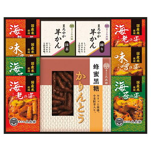 内容蜂蜜黒糖かりんとう(40g)・あられ(海老・海苔・味噌)(12g)・羊かん(抹茶・練り・小倉)(60g)×各2、黒胡麻かりんとう(40g)・落花生かりんとう(40g)×各1 パッケージ化粧箱 箱サ...