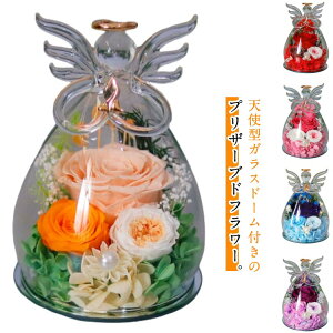 天使型ガラスドーム付きのプリザーブドフラワー。【いつまでも綺麗なお花を捧げたい・・・】・色彩豊かなプリザーブドフラワーをガラス容器に閉じ込めた「ガラスドームアレンジメント」【プリザーブドフラワーって?】・本物の生花を