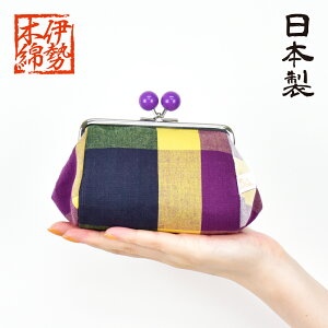 【 日本製 】 三重の伝統工芸「伊勢木綿」先染め 柿渋染め ガバっと開いて沢山収納 無骨な がま口ポーチ 化粧ポーチや小物入れ ミニバッグに