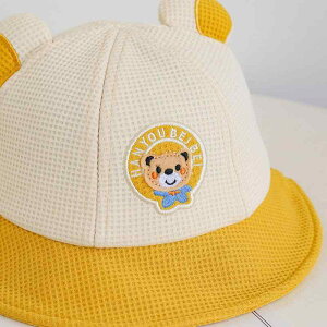【ベビーハット】耳が立体で付いているクマモチーフのベビーハットです。程よい深さと広めのつばで、紫外線からお子様の顔を守ってくれます。キュートなクマのデザインで、女の子も男の子も被りやすい。 【素材】コットン、ポリエステ