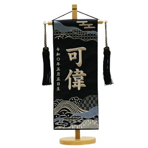 赤ちゃんの名前と生年月日が入れられる名前旗。 お名前と生年月日はシャンパンカラーの刺繍で仕上げた、ナチュラルテイストの名前旗です。 悠々と空を泳ぐ鯉のぼり富士山。 無限に広がる波に吉祥モチーフをちりばめた和柄。 どちらもお