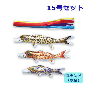 黒鯉1.5m・赤鯉1.2m・青鯉1m・矢車一式・ロープ・ポール2.3m(伸縮性)取付金具 スタンド式(水袋付)。鯉のぼり 薫風の舞い鯉 風舞い。ポリエステル素材に波柄を織り込んだジャガード織に、伝統の捺染技法によるぼかし染めをし...