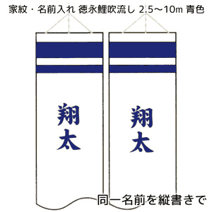 徳永鯉 名前入れ 同一名前を縦書きで両面に青色で入れる 10m〜2.5m吹流し用です。 名前入れについて 名前入れの書体は『太楷書体』になります。 漢字の中に『令』の文字が入る場合、下の部分が『マ』の形に統一させて頂きます。 メーカー