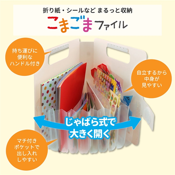 【商品】折り紙やシールなど、日常のこまごました物を収納できるファイル【特長1】蛇腹形状なのでワンアクションで中身を取り出しやすく、片付けしやすい【特長2】開くと自立し、中身が一覧できて探しやすく、えらびやすい【特長3】ハ
