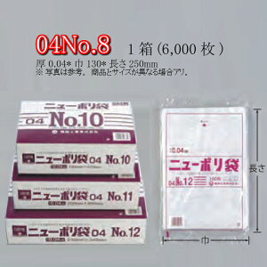 商品名 ニューポリ規格袋0.06 No.8 商品コード 0440930 サイズ 厚0.06mm×巾130mm×長さ250mm ケース入数 4,000枚 袋入数/化粧箱入数 50枚/500枚 重量(g) 3.60 形状/色/素材 平袋/...