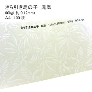 製品仕様 商品名 きら引鳥の子 鳳凰厚さ60kg(0.13mm) A3 100枚 サイズ A3(420mmx297mm) 枚数 100枚 厚さ 約0.13mm 柄 鳳凰。白い和紙にキラ(雲母)で鳥の模様をちりばめた和紙。