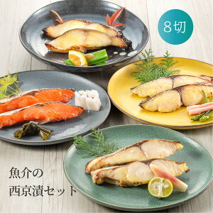 魚介の西京漬セット(2切入×4袋)化粧箱入 名称 食品 内容量 2切入×4袋 原材料 銀だら西京漬:銀鱈(アメリカ産)、みそ(国内製造)、果糖ぶどう糖液糖、食塩、砂糖/酒精、調味料(アミノ酸等)、増粘剤(キサンタン)、着色料(V.B2
