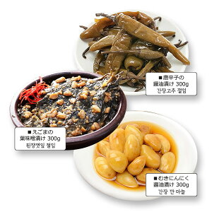商品説明名称韓サイおかずセット(唐辛子の醤油漬け300g + えごまの味噌漬け300g + むきにんにくの?油漬け300g)6原材料名 1.製品名 :唐辛子の?油漬け 唐辛子(韓国産)いり胡麻、醤油(遺伝子組換えでない、小麦、 食塩、...