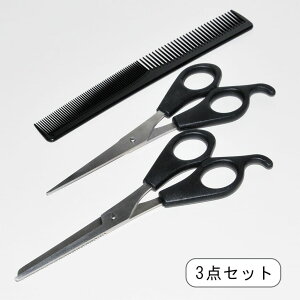 ■商品説明 自宅でのセルフカットや子供の散髪に使用できる、 カットハサミ、スキバサミ、コームの3点セットです。 カットハサミとスキバサミで自然な仕上がりに。 コームは荒目と細目が一体化しており、 用途により使い分けることが