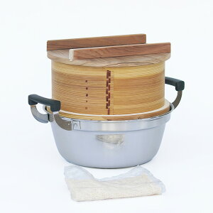 おもちを蒸すのに最適な、和せいろ鍋付セット1升用です。せいろ、かまふた、ステン鍋、蒸し布、竹すがセット。これひとつでお手軽に蒸すことができます。