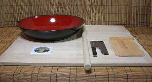 《セット内容》 麺台:桐 L 90cm×80cm××厚さ約2cm フェノールこね鉢:外径54cm 麺切り包丁:二七の壮次郎・ステンレス刃渡り27cm 麺棒:ほお 3,5×90cm 駒板L:天然木 21cm×26cm そば