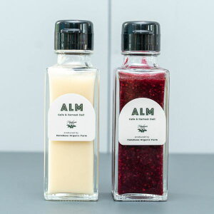 くせのない爽やかな風味のたまねぎドレッシングと、はなぶさ有機農園で有機栽培されたブルーベリーのドレッシング