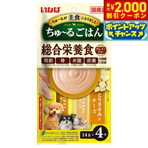 愛犬に必要な栄養素をバランスよく配合した総合栄養食。関節・骨・お腹・皮膚の健康に配慮した今までないごはん。穀物アレルギーにも配慮しており、グレインフリーに仕上がっております。商品名いなば ちゅ〜るごはん とりささみ&チ